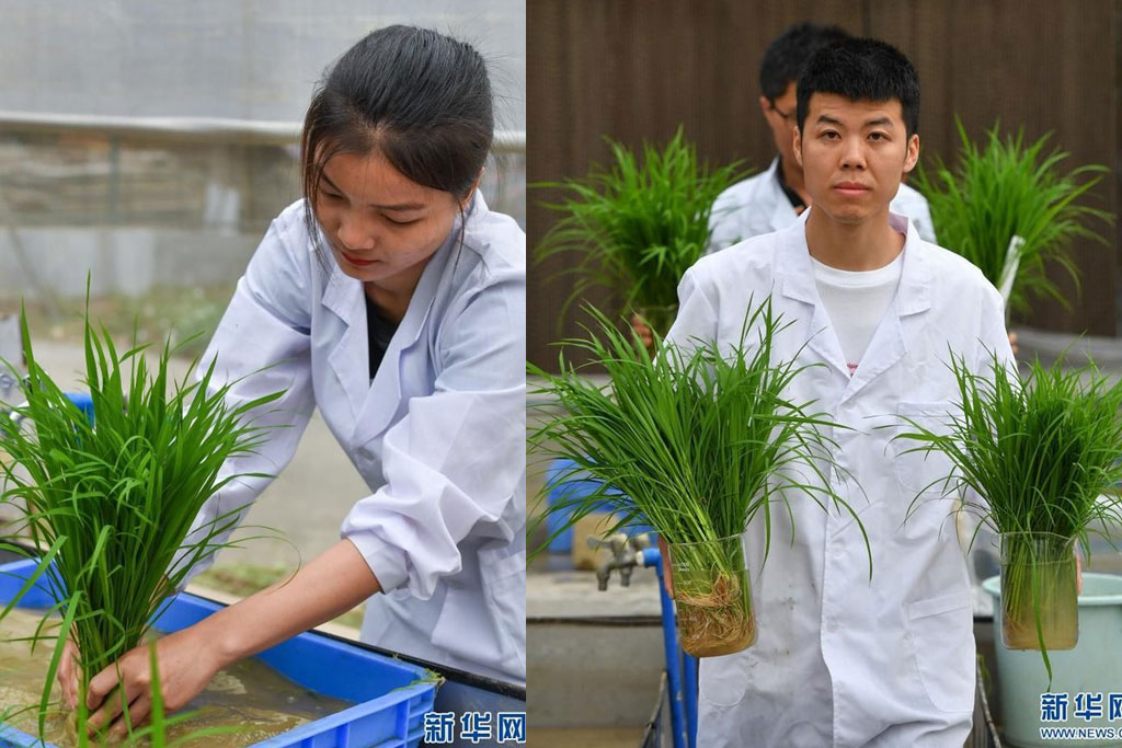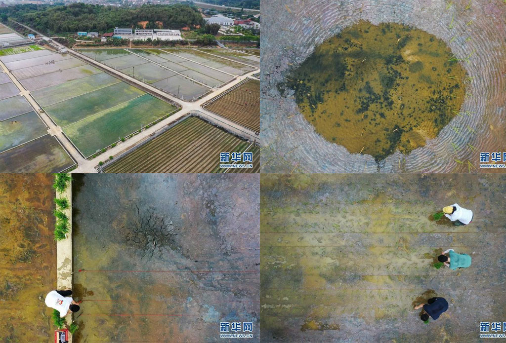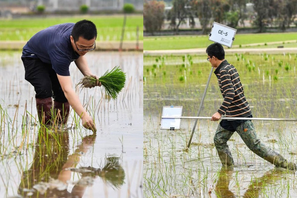 (左圖)研究人員在廣州增城華南農(nóng)業(yè)大學(xué)試驗(yàn)田插種嫦娥五號搭載的太空稻秧苗。
