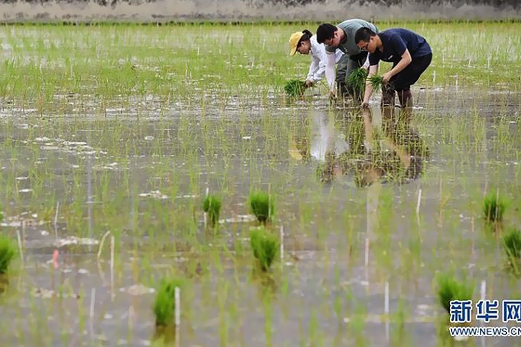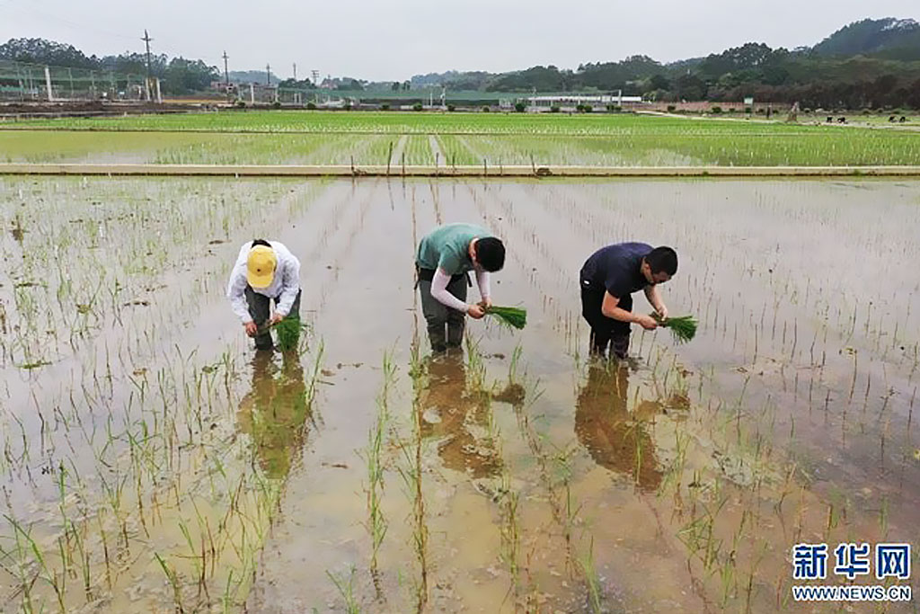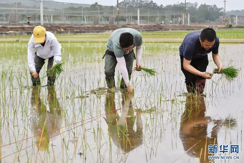 研究人員在廣州增城華南農(nóng)業(yè)大學(xué)試驗(yàn)田插種嫦娥五號搭載的太空稻秧苗。