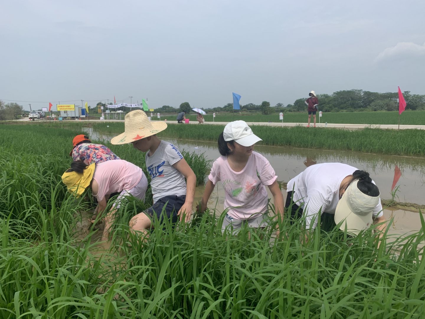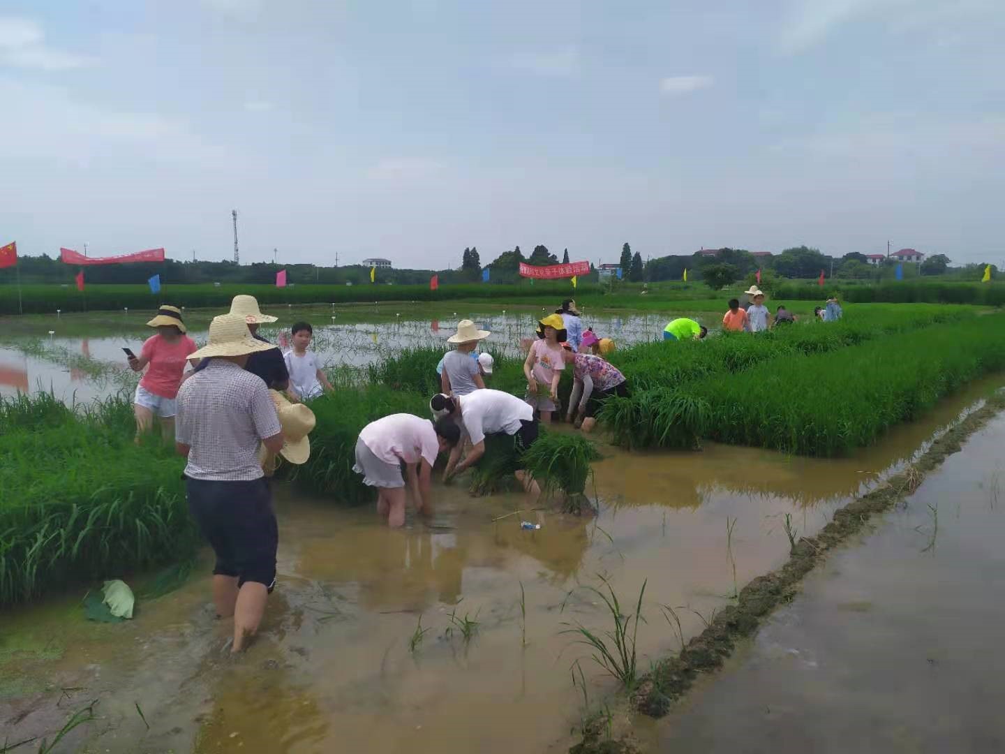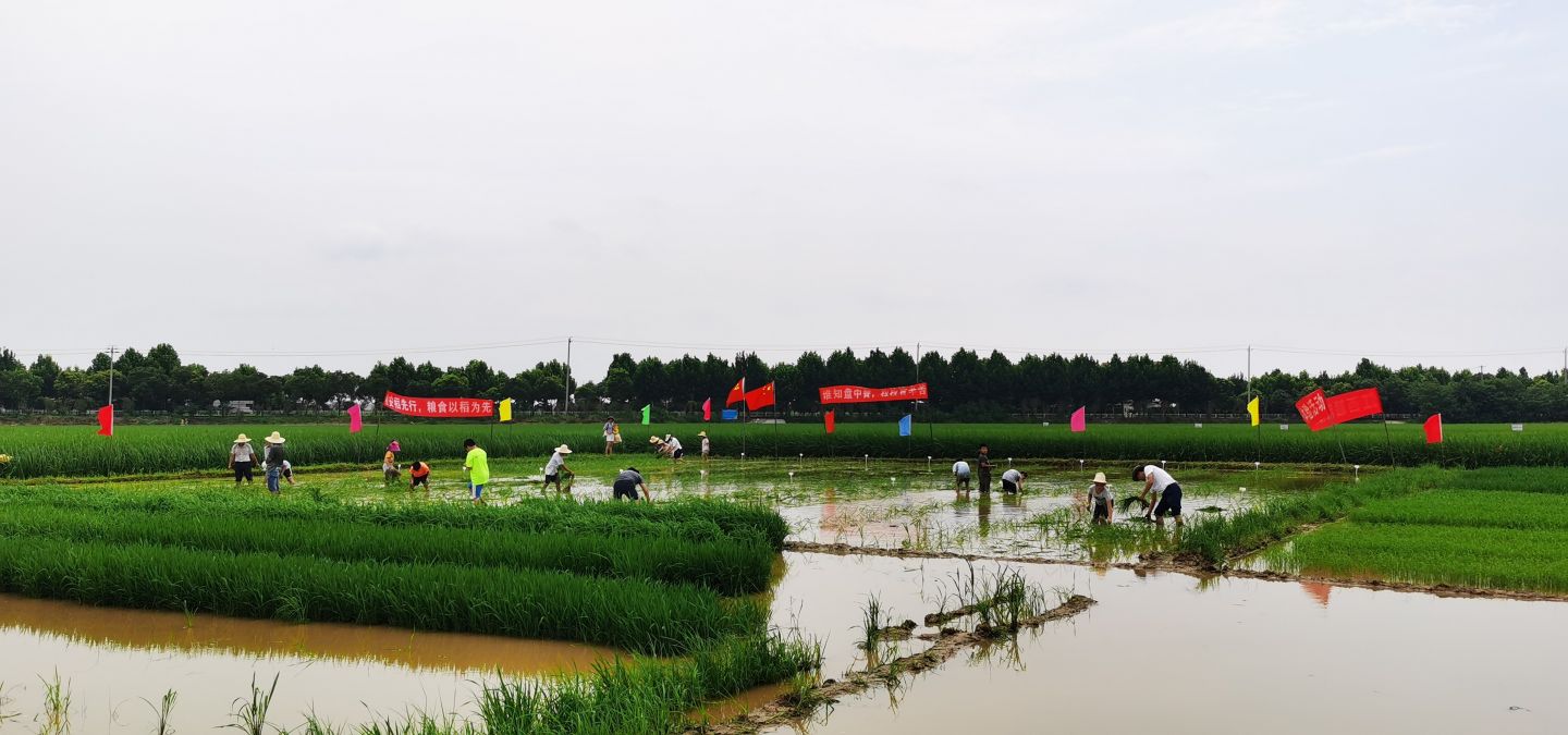 上午9點(diǎn)整,活動(dòng)開始,先由江西贛糧院士工作站藍(lán)海軍副主任向大家介紹基地情況,然后帶著大家來到科普區(qū),一一介紹了正在展示的各種顏色和形狀的30多種特種稻,并隆重介紹了基地工作人員以稻為筆,“繪制”的黨旗等彩色稻圖案為百年建黨節(jié)獻(xiàn)禮。然后,來到基地正在實(shí)施的“無人農(nóng)場”項(xiàng)目區(qū),介紹了無人農(nóng)場的運(yùn)行過程和智慧農(nóng)業(yè)實(shí)施應(yīng)用情況。隨后藍(lán)海軍副主任拿起了一個(gè)基地正在使用的生物植保器具“二化螟性誘器”為大家講解它的捕蟲原理。接著,又通過圖片給大家上了一節(jié)關(guān)于我國農(nóng)耕文化發(fā)展過程的科普教育課。最后,孩子們在基地場長劉平洲的帶領(lǐng)下整齊有序地排成隊(duì)伍來到一塊水田旁,像快樂的小鴨子一樣一個(gè)個(gè)走下田去,手沾土,腳踩泥,與農(nóng)田親密接觸。在技術(shù)人員的指導(dǎo)下他們先完成拔秧的工序,然后把自己拔的秧又一棵棵整齊有序地栽插到屬于自己的小田塊里。“株距大約18厘米,行距大約20厘米。左手握秧,右手捏兩株左右秧苗往泥里插,不能太深也不能太淺......”不等劉平洲場長“崗前培訓(xùn)”完,孩子們迫不及待地插起田來。認(rèn)真程度不亞于農(nóng)民伯伯。不一會(huì)兒就完成了一大半。個(gè)別小朋友在水田中寸步難行,甚至一度重心失衡,一屁股坐在水田里,惹得大家發(fā)出一陣陣愉快的笑聲。