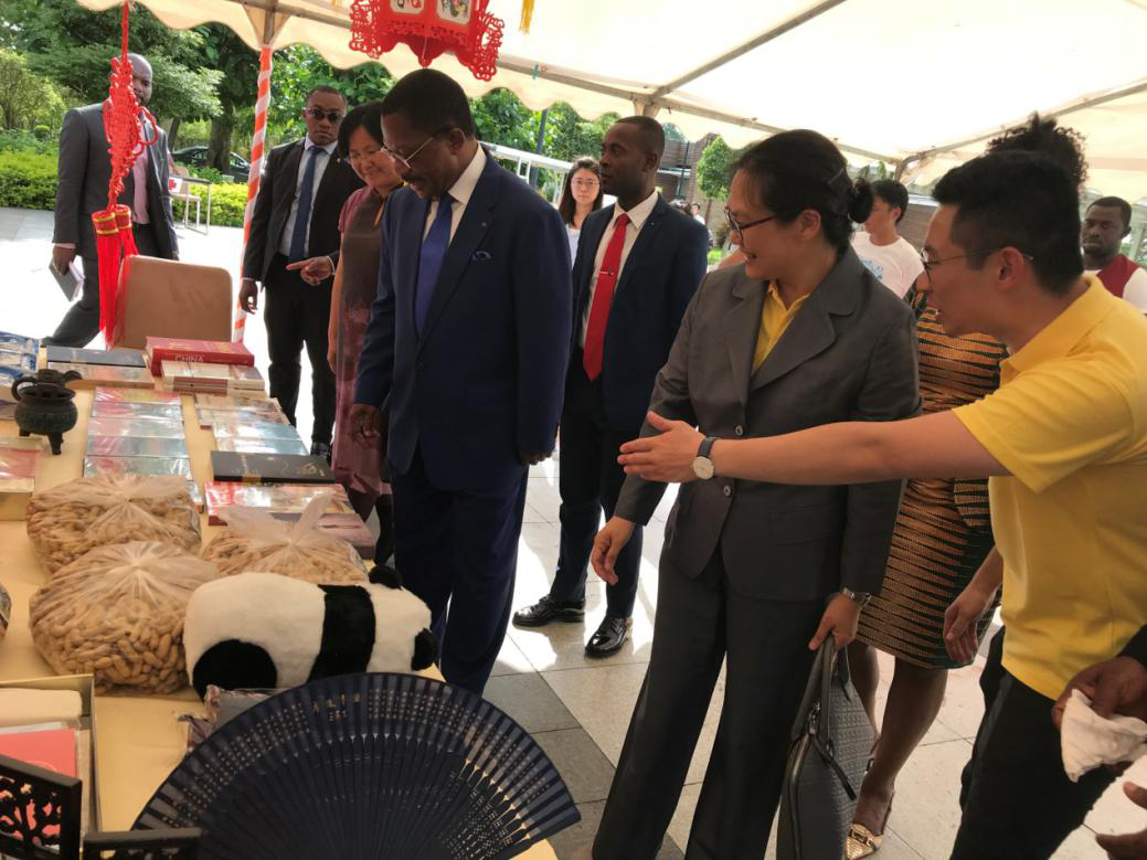 亓玫大使陪同赤道幾內(nèi)總理奧巴馬參觀中國(guó)商會(huì)展臺(tái)