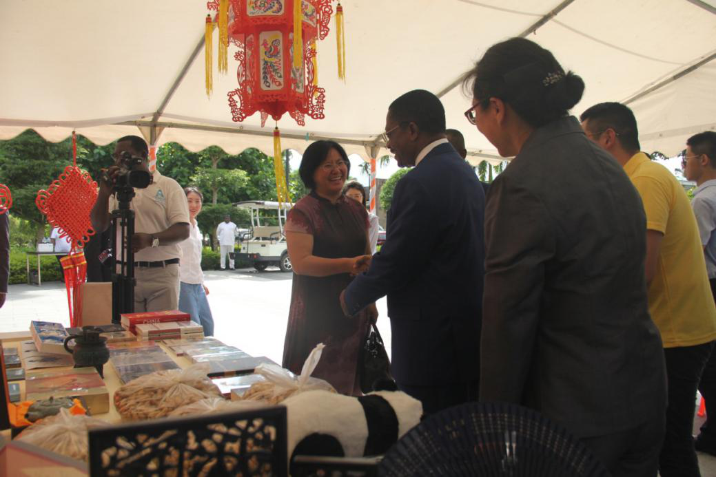 義賣活動(dòng)在中企建設(shè)的馬拉博國(guó)家公園舉行。現(xiàn)場(chǎng)各國(guó)展臺(tái)中,面積最大、貨品最豐富的,當(dāng)數(shù)中國(guó)展臺(tái)。中國(guó)駐赤道幾內(nèi)亞大使亓玫陪同奧巴馬總理參觀了中國(guó)展臺(tái)。在展臺(tái)上,鮮艷的五星紅旗、喜慶的中國(guó)結(jié)和燈籠,彰顯中國(guó)特色;陶瓷、漆器、臉譜、折扇、茶具、絲綢、文創(chuàng)、書籍、飲品,讓人應(yīng)接不暇。
